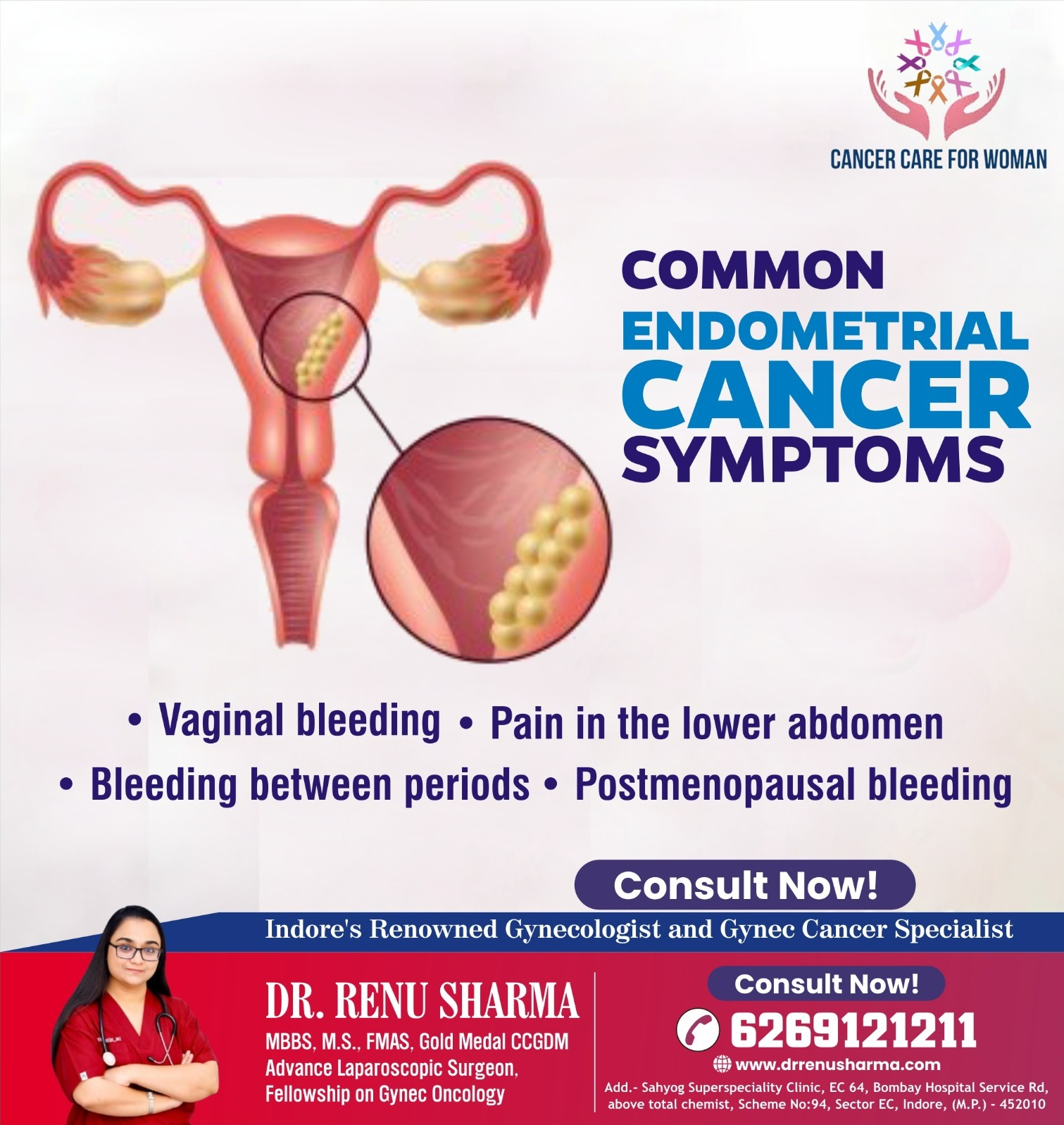 Endometrial Cancer Treatment in Indore Looking for expert endometrial cancer treatment in Indore? Dr. Renu Sharma at Gynae Onco Care Clinic offers advanced and compassionate care for women diagnosed with uterine (endometrial) cancer. Early diagnosis and timely treatment are crucial for better outcomes and recovery. Dr. Renu Sharma best oncologist in Indore specializes in comprehensive cancer care, including accurate diagnosis, staging, and personalized treatment plans. Treatment options may include surgery, minimally invasive procedures, and supportive therapies based on the patient’s condition. The focus is on providing effective care while ensuring patient comfort and safety. At Gynae Onco Care Clinic, modern technology and a patient-centric approach ensure high-quality treatment and continuous support throughout the journey. From consultation to post-treatment care, every step is handled with expertise and compassion. If you are searching for the best endometrial cancer treatment in Indore, consult Dr. Renu Sharma today for trusted and specialized oncological care.